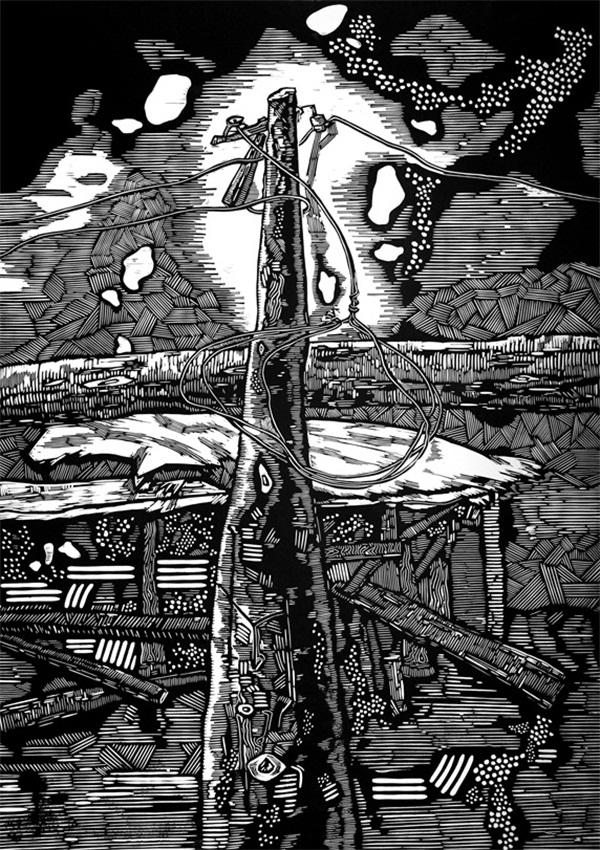 贾昕东 有桅杆的风景 黑白木刻 2016 90X60cm